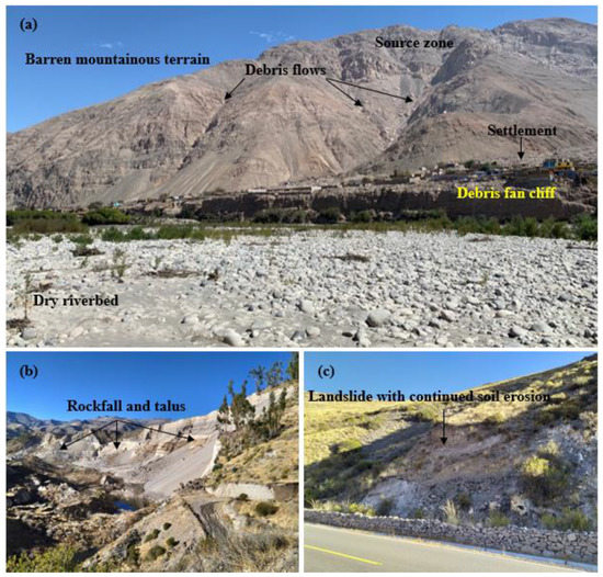 The area shows a diversified topography, where the elevation ranges from 0 to 6389 m. The major landcover/land use of the area includes scrubland, barren land, snow cover, grassland, waterbody, cropland, and built-up land. A major portion of the area is covered by scrubland and barren land. The major soil types found in the area include cambisols, leptosols, and regosols. The area receives an average rainfall of 96 mm/year, where January to March are the wettest months and the rest of the months are predominantly dry. The surface temperature usually ranges from 5 to 25 °C. Camana, Aplao, Chuquibamba, Cabanaconde, and Chivay are major communities within the study area and are vulnerable to geologic hazards, including landslides. Figure 2 shows field photographs captured during field visits. These photographs are intended to provide a sense of the overall topography, vegetation cover, and climatic condition of the study area. Figure 2a shows a barren mountainous terrain susceptible to landslides that produce regular debris flows that have been cut by the river. The communities have built their houses on the old debris fans, which are highly vulnerable. Figure 2b presents a highly active rockfall area that is situated in the region of active geological faults. Figure 2c shows vegetation patterns in high-altitude areas of Chivay dominated by dryland grasses and bushes.