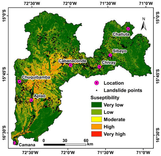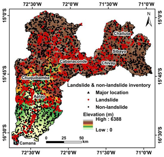The topographical, hydrological, and geo-environmental settings of southern Peru result in several types of landslides (e.g., rockfall, rock and soil slides, debris flows, shallow, and deep-seated landslides) that cause risk to human lives, infrastructure damage, economic instability, and landscape degradation. In general, landslides are triggered due to several factors, such as heavy precipitation, earthquakes, and volcanic and anthropogenic activities [5]. The frequency and impact of landslides are expected to increase in the future due to urbanization, highway construction, and deforestation [4,5,6]. Although landslides cannot be prevented, their impacts can be mitigated by developing spatial susceptibility models, which can be used in risk zonation and mitigation management [5,7,8].