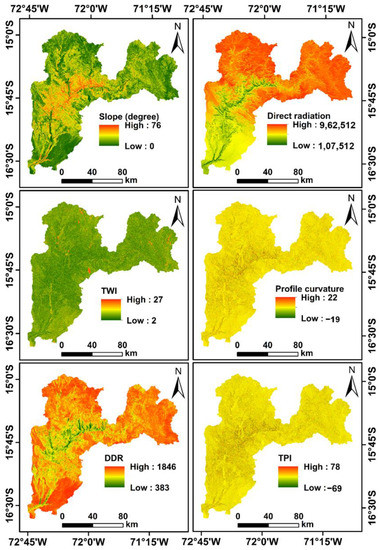 - TWI represents the flow accumulation and slope of the area and typically corresponds to the water saturation zone [70]. Lower and higher values of TWI are typically associated with steep and flat or valley regions, respectively [71]. TRI describes surface heterogeneity as concave upward and convex slopes [72], whereas TPI computes the difference between the elevation of each pixel and its neighbors within a specified radius [73]. TPI can also be used to define geomorphic landforms as ridges (positive TPI), valleys (negative TPI), and flat areas (~0).