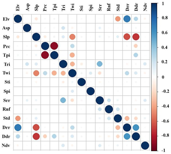 The selection of optimal LIFs is crucial in developing robust ML models to accurately discriminate between landslide and non-landslide areas. The selection of optimal LIFs was performed using multi-collinearity statistics and EFS, as described in Section 2.3.3. The multi-collinearity test enables the detection of collinearity among different LIFs, whereas EFS helps to assess their relative importance to discriminate between landslide and non-landslide areas. Figure 6 displays the Pearson correlation among continuous LIFs. The major advantage of using EFS over an individual FS approach is that it reduces the biases and uncertainty in evaluating the LIFs’ importance and yields stable results. The 24 LIFs were within the acceptable VIF (i.e., 2.03–6.19) and tolerance range (i.e., 0.49–0.16) (Table 3) and were used in EFS.