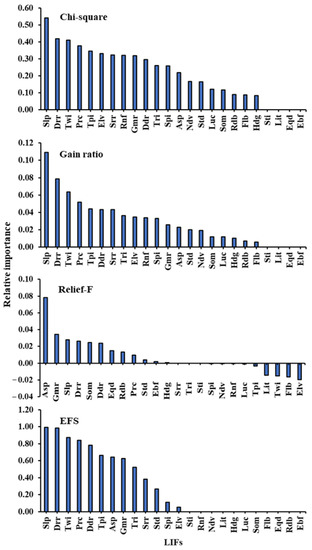 FS is a process of optimal selection of variables to improve the prediction or classification accuracy and reduce a model’s complexity. Chi-square [32,84], IG [11,32,85], GR, and relief-F (RF) [32,42,84] have been successfully used as FS methods in LSMs. We used these FS methods to develop an EFS method for the optimal selection of LIFs. The FS methods are summarized below in Table 2.