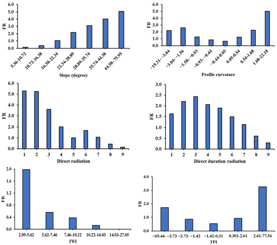 The FR is one of the most extensively used bivariate statistical methods in LSM to illustrate the correlation between the spatial distribution of past landslides (i.e., landslide inventory) and LIFs [13,92]. The class of LIF that yields values of FR ≥ 1 exhibits a higher correlation between the landslides and the corresponding LIF, and vice versa [79]. The FR of LIF i for the j-th class can be calculated using Equation (8):