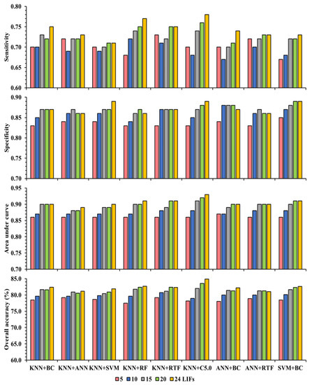RF is an ensemble learning approach which consists of many decision tress (DTs), where the decision in assigning the final class label is made by the majority vote of all DTs [104]. The RF overcomes the limitation of DTs of overfitting to training data [105]. The success of RF is due to its method of developing different DTs, where each tree is grown on the new training data using random variables. It uses a bagging technique that generates a random training set with the replacement of the original training data for each variable or a variable combination [104]. The implemented RF method consists of one hyperparameter, i.e., mtry, which is the number of input variables randomly sampled at each split when creating DTs.