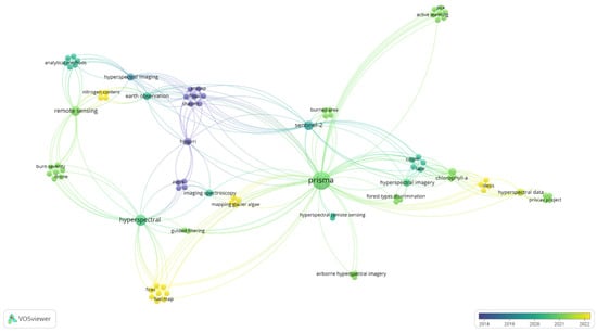 Knowledge mapping (2018–2022): scientometric analysis using VOS-viewer software. The color bar at the bottom right corner denotes the year of the publication. This scientometric analysis considered publications from 2018 to 2022 because the PRISMA satellite launched in 2018.