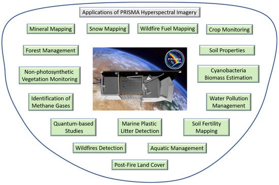 PRISMA hyperspectral imagery (PHSI) has been used for applications such as forest fuel mapping [1]; forest discrimination [2]; burned area mapping [3]; prediction of methane emissions [4]; agricultural applications [5]; the study of geochemical investigations for parameters of soil moisture, soil organic matter, and soil organic carbon [6]; the study of water quality [7]; and geological applications [8,9]. The ‘Sviluppo di Prodotti Iperspettrali Prototipali Evoluti’ project funded by the Italian Space Agency is developing procedures to map fire presence and fire severity, the extent of fire fuel, urban growth, urban areas, industrial areas, volcanic areas and volcanic parameters, and vegetation. PRISMA proved to be a valuable instrument for the determination of the residual fire severity in an investigated area (ASI|Agenzia Spaziale Italiana). Thus, the PRISMA satellite has wide applicability [10].