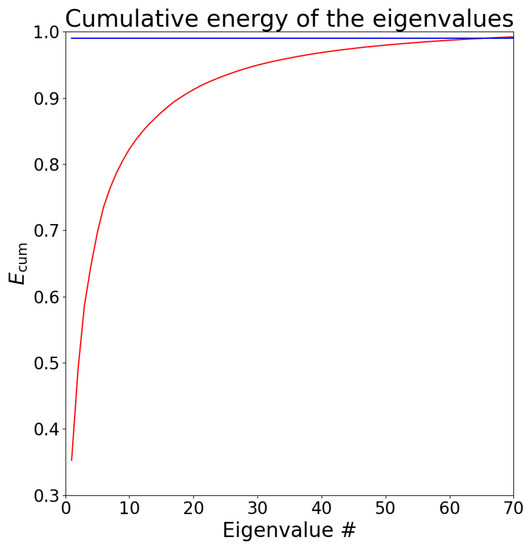 We find the eigenfunctions , the eigenvalues , representing the time-average of the energy contained in the j-th POD mode, sorted in descending order, and the coefficients of the POD development, respectively, with . We adopt a generally accepted criterion to select the most meaningful eigenfunctions, which consists in considering the most energetic modes whose sum reachs at least the of the average energy [15,16,17]. This selection is associated with the first most energetic eigenvalues. Figure 2 shows the cumulative energy of these modes (red line), which converges to the selected threshold corresponding to the of the energy (blue line) at about . As the effective temperature is a positive-definite quantity, we subtracted from each snapshot the time average of the field , in order to do the analysis on the temperature fluctuations only. We did this because we are interested in capturing the spatial and temporal evolution of the turbulent structures. By retaining the average of the temperature, the first POD mode would have been coincident with this average and would have captured the bulk of the energy of the flow. However, this large-scale structure is not directly related to the turbulent fluctuations at small scales whose study we are interested in, therefore we excluded it a priori from the computation and limited our attention to the evolution of the turbulent motions.