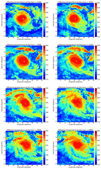 The sequence in Figure 3, showing the temporal evolution of Faraji, is a subset of the total database acquired by the SEVIRI sensor onboard MSG-8 IODC. This image series is taken as the representation of a part of the raw images in the total database. In these we show the result of the resizing of the observed scene, which centers the Faraji’s structure in the geographical area at the different sensing times, from which we start to extract the effective temperature field. We applied the POD to the set of 93 images, corresponding to one single day of the lifetime of Faraji, during its maximum intensity phase. We did not consider the whole cyclone’s lifetime since the POD analysis applies better to data with no transient states.