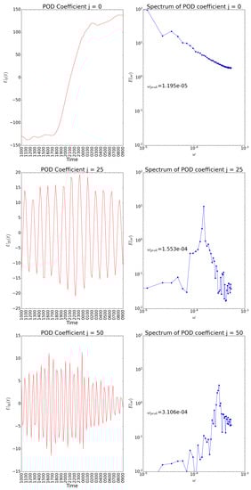 Concerning the POD temporal coefficients, we analyze the trends of the extracted , and coefficients and their associated Fourier spectra. As for the spatial component, it is clearly visible from the plots in the left panels of Figure 8 that the number of oscillations in time increases for increasing values of j. The right panels show that the frequency corresponding to the maxima, the characteristic , increases with higher values of j.