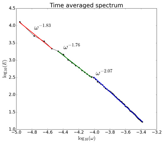 Energy spectrum of the temporal component of the Faraji effective temperature field. The exponents correspond to the spectral indices of the three different zones, highlighted by the scale separation.