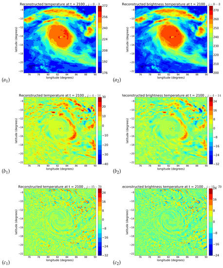 Comparison between effective temperature field reconstructions (suffix 1) and brightness temperature ones (suffix 2), at 21.00 UTC on 8 February 2021 for Faraji hurricane. We show large scales in (a), intermediate scales in (b) and small scales in (c).