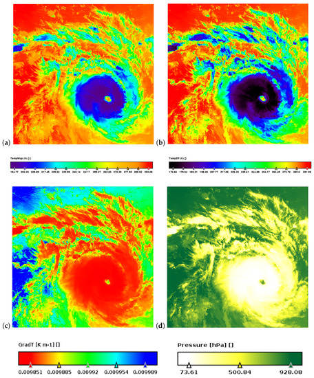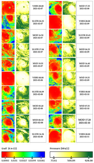 Furthermore, in order to show the physical quantities evolution in the Faraji structure, from all LEO sensors, in Figure 14 we report all the images resized into 2D representations of pixel, displayed as a sequence of the temporal evolution, in the lifedays from 7 February to 10 February, of the temperature gradient (a) and the pressure field (b) for the cyclone. The main purpose is to highlight, using 20 of the 32 available images from MODIS, SLSTR and VIIRS, the Faraji transformation at different sensing times, and how this is displayed by the three different radiometers. We selected those scenes among the others because at those times the cyclone has a more well-defined central structure and its evolution in the days of greater intensification is better visible in its cloud system.