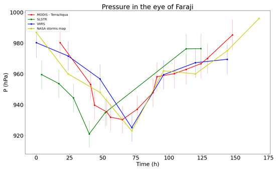 Further comparisons provided important results in the evaluation of the temporal trend of the pressure in the eye of the cyclone. For this analysis we consider the 168 h of evolution of Faraji, between 00.00 UTC of 6 February and 00.00 UTC of 13 February. In Figure 15 the pressure values calculated for the different sensing times is shown. Curves identify the evolution trends of these values, and it is immediately noticed that products obtained for MODIS and SLSTR display different behaviors, whereas a slight consistent trend is observed for VIIRS. In fact, the latter fits better than MODIS and SLSTR the eye pressure data recorded in the storms map of NASA Zoom Earth database (yellow line), within the limits of the uncertainty ranges.
