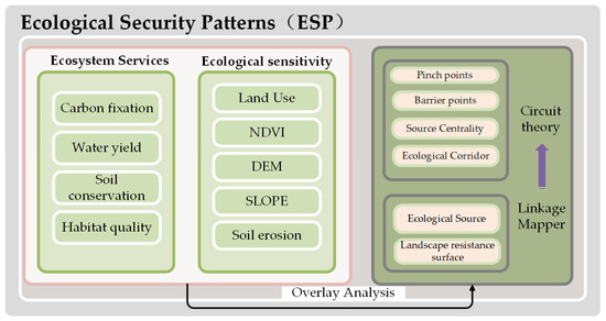 With the rapid expansion of human activities, the ecological environment [1,2] is gradually being fragmented and destroyed. On the one hand, habitat fragmentation has led to biodiversity reduction. On the other hand, the conflict between economic development and environmental protection is intensifying, leading to new demands on ecosystem services [3,4,5]. The ecological security pattern mainly refers to a potential spatial pattern composed of key points, lines, parts (planes), or spatial combinations that plays a crucial role in maintaining and controlling ecological processes and is also the basic guarantee for realising ecological security [6,7]. As a bridge between ecosystem services and social development, the design of ecological safety patterns has become an important tool for governments at all levels to ensure sustainable regional economic development and to coordinate the relationship between ecosystems and economy and society [8,9].