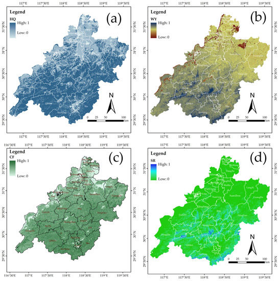 Figure 3. Spatial pattern of four types of ecosystem services in southern Anhui; (a) HQ: Habitat Quality; (b) WY: Water Yield; (c) CF: Carbon Fixation; (d) SR: Soil Retention.