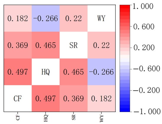 The 20,000 attribute points in the study area were randomly selected. Normalised values for the four ecosystem services were extracted into attribute tables using ArcGIS tools. Finally, Pearson correlation analysis was used to explore the synergistic and trade-off effects of ecosystem services in the study area. The results (Figure 4) indicated that there was a trade-off between habitat quality (HQ) and water yield (WY) in southern Anhui, with a correlation coefficient of −0.266, while the other ecosystem services were all synergistic. It is worth noting that the synergy between habitat quality (HQ) and carbon fixation (CF) was high at 0.497, which was related to the presence of large areas of woodland in the mountainous areas of southern Anhui. The large area of woodland has a strong role in regulating climate while constituting ecological land for species to inhabit.