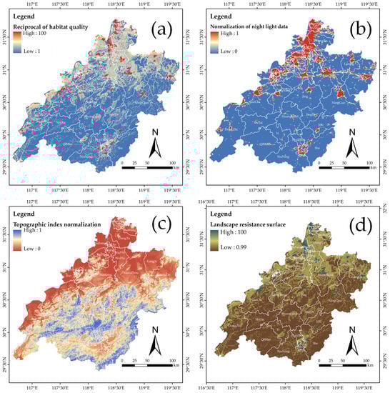 Figure 6. Ecological resistance surface in southern Anhui; (a) is the reciprocal of habitat quality; (b) is the night light index after standardization; (c) is the night light index after standardization; (d) is the landscape resistance surface.