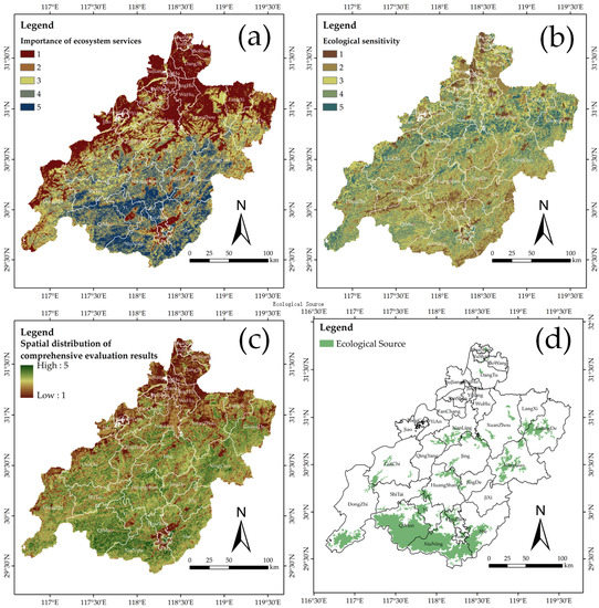 Figure 7. Construction of ecological source sites in southern Anhui; (a) is the importance of ecosystem services; (b) is the ecological sensitivity; (c) is the spatial distribution of comprehensive evaluation results; (d) is the ecological source. (Note: 1 to 5 as extreme, slightly poor, medium, good, and excellent, respectively).