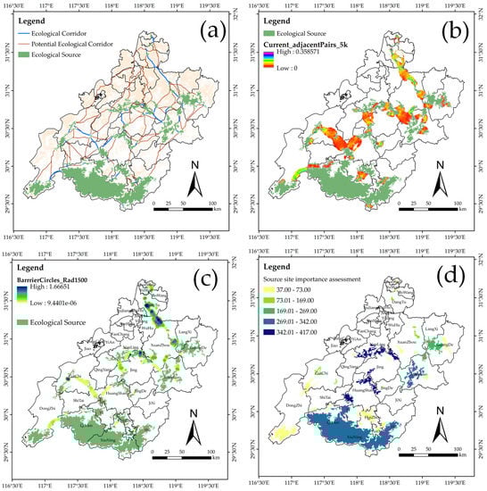 Figure 8. Distribution of ecological corridors in southern Anhui; (a) shows the spatial distribution of ecological sources and corridors; (b) is the current value of the pinch point; (c) is the current value of the obstacle point; (d) is the centrality score of the ecological source.