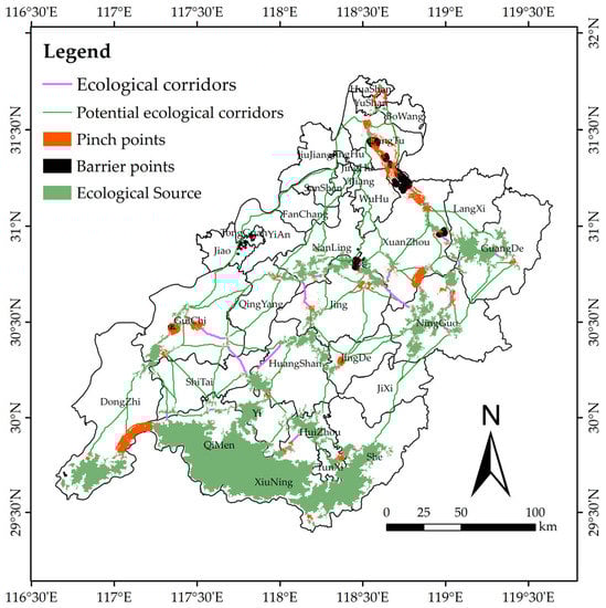 Barrier points are areas that impede the movement of species from ecological source sites to other source sites and may be natural barriers, such as overly wide rivers, cliffs, etc., or the result of the construction of new areas, the establishment of industrial parks, the assumption of large airports, etc. The Barrier Mapper tool identified 6 barrier point patches occurring in southern Anhui, distributed in densely built-up areas such as the urban areas of Xuancheng City and Huangshan City. One of the largest barrier spots appeared in the middle of Xuanzhou District, Xuancheng City. The actual survey found that the central part of Xuanzhou District was an urban area, mostly used for construction. It was surrounded by ecological sources with a good ecological environment such as Jingting Mountain National Forest Park, China Crocodile Lake, and Hua Tuo Ling [38,54]. The barrier points around Huangshan City, on the other hand, appeared to be blocked by the construction of industrial parks and high-tech zones. The government can take measures to address this situation, such as setting up strip green areas in the district to form a green ecological network, which can restore the connectivity of several ecological source areas in the district and improve the ecological stability of the region [34,55].