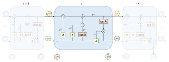 In Equations (5)–(8), w and b represent the weight and the deviation, respectively; tanh and sigmoid represent the activation function; and and represent the input gate, forget gate, output gate, and input information, respectively. Figure 1 shows the internal structure of the LSTM, which mainly progresses through three stages: