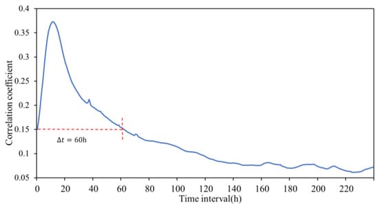 where , , , and represent runoff, average runoff, precipitation, and average precipitation, respectively; represents the offset between runoff and rainfall time. The correlation coefficient curves of different offsets are shown in Figure 4. The impact of hourly rainfall on change in runoff first increases and then decreases; it eventually reaches the same magnitude as the starting point after 60 h, indicating that hourly rainfall can effectively influence the change in runoff in the basin over the next 60 h.