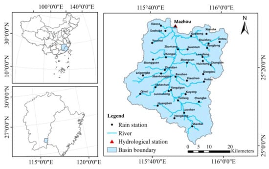 Location of the Mazhou Basin (China) and distribution of stations in the basin.