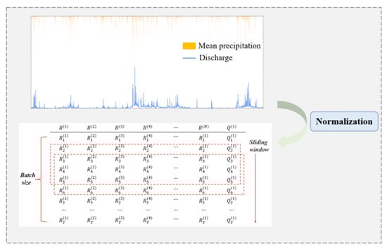 The dataset was obtained by sliding the window in chronological order through the whole rainfall–runoff sequence. The size of the sliding window was set according to the timestep. The process of dataset preparation is shown in Figure 6. The dataset was divided into training and testing sets, which constituted 80% and 20% of the total records, respectively. The training set was used to calibrate the model parameters, whereas the testing set was used to evaluate model performance. To ensure consistent model input and enhance convergence speed during model training [], the rainfall and streamflow were normalized before the training process: