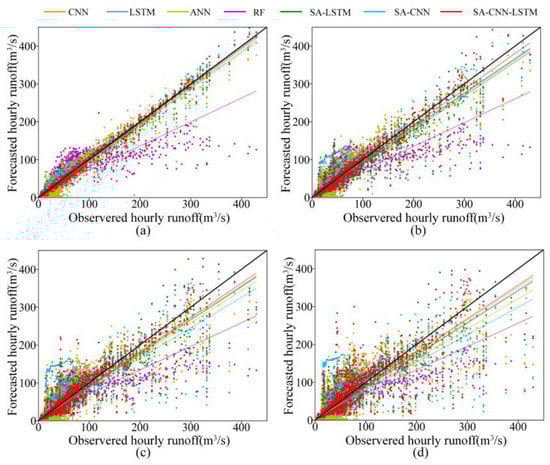 Scatter plots and fitting lines of prediction results for each model at lead times of 1 (a), 3 (b), 5 (c), and 7 (d) h.