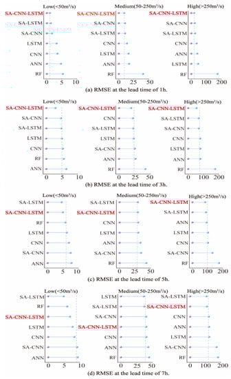 In terms of hydrology, high flow is important for flood forecasting, which can predict the impacts of potential floods and reduce the risks of economic loss. Low flow can affect the sustainable water supply for agricultural departments or groundwater recharge []. We divided streamflow into three categories according to flow value: low (0–50 m3/s), medium (50–250 m3/s), and high (>250 m3/s). We evaluated the performance of the SA-CNN-LSTM model with respect to prediction of streamflow in the different categories. Figure 8 shows the comparison of prediction results among models, according to RMSE, for the prediction periods of 1, 3, 5, and 7 h. The SA-CNN-LSTM exhibited excellent performance at various streamflow values. With increasing lead time, the model exhibited some degradation at low and medium flow values, but it maintained good performance at high flow values. These results indicate that the model is more stable with increasing lead time at high runoff flow values.