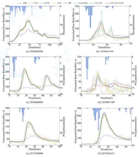 As shown in Figure 9, six flood events were selected for evaluation of the SA-CNN-LSTM model’s performance during actual flood events; these events were 2020040200, 2020042100, 2020060800, 2020081109, 2021050900, and 2021051612. In addition, the evaluation indicators of these six floods were shown in Table 4, where PE was used to evaluate the performance of the flood peak predicted by the model. SA-CNN-LSTM showed the best performance in six flood events, and NSE of five floods was above 0.9. For the prediction of runoff peak, the PEs of SA-CNN-LSTM in six flood events were all within 3%, indicating that the flood peak prediction was also effective.