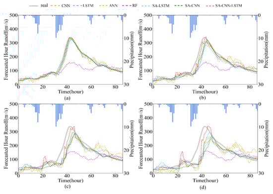Comparisons of the predictions of the flood event (2021053000) from each model at the lead times of 1 (a), 3 (b), 5 (c), and 7 (d) h.