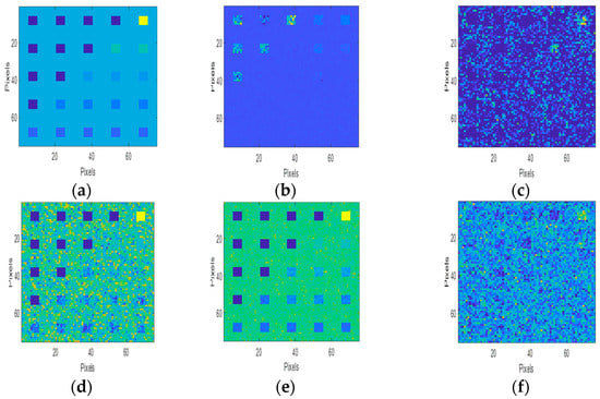 For comparing the performance of all methods, a simulation of data, selected from the USGS library, is tested. The spectral library we chose is ℝ [], which is the Chapter 1 of the USGS library. As shown in references [], five spectral features are selected from the spectral library to generate hyperspectral images of 75 × 75 pixels. For this experiment, the added Gaussian noise is SNR = 20 dB.