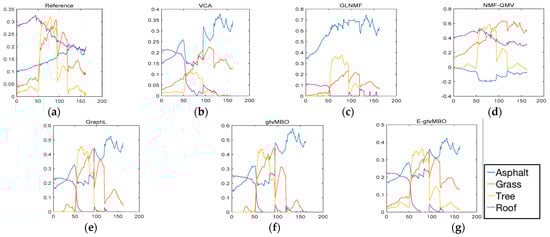 In this experiment, our unmixing results are presented in Figure 2 and Figure 3 and Table 2. In detail, Figure 2 is endmember maps of the Urban dataset; Figure 3 is abundance maps of the Urban dataset; Table 2 quantitatively compares the performance of all methods. In Table 2, we list the RMSE, nMSE, and SAM values of eight unmixing methods (FCLSU, SUnSAL-TV, GLNMF, FRAC, NMF-QMV, the graph Laplacian, the gtvMBO, and the E-gtvMBO). From Figure 2, we can know that the endmember map of gtvMBO is the closest to the reference image. Figure 3 shows the estimated abundance maps of eight unmixing methods for the Urban dataset. In Figure 3, from above and below are FCLSU, SUnSAL-TV, GLNMF, FRAC, NMF-QMV, GraphL, gtvMBO, and the proposed E-gtvMBO methods, respectively. Most of these methods, such as FCLSU, FRAC, SUnSAL-TV, GLNMF, and NMF-QMV, especially when the endmembers are asphalt and roofs, produced abundance maps with low image contrast. The E-gtvMBO, gtvMBO, and GraphL methods can enhance the contrast of abundance maps. It is worth noting that since NMF-QMV does not enforce the abundance matrix to be non-negative; the resulting spectrum of pitch is below zero in NMF-QMV.