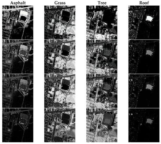 In this section, the real hyperspectral data we used are from the Urban dataset. The Urban dataset has four reference endmembers, which are asphalt, grass, tree, and roof. It contains 210 spectral bands, but bands 1–4, 76, 87, 101–111, 136–153, and 198–210 were removed due to dense water vapor and atmospheric effects, leaving 162 spectral bands in the end. The hyperspectral images contain 307 × 307 pixels; the spectral resolution is 10 nm.