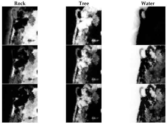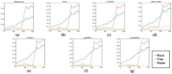 In this part, we use the Samson data with 95 × 95 pixels and 156 spectral bands after preprocessing, whose reference has three endmembers. Its wavelength range is 401 nm to 889 nm, and the spectral resolution of Samson dataset is 10 nm. The unmixing results are given in Figure 4 and Figure 5 and Table 3 for endmembers, abundance maps, and quantitative metrics, respectively.