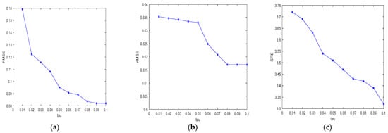 (a) RMSE (b) nMSE (c) SRE evaluating at different for the urban data.