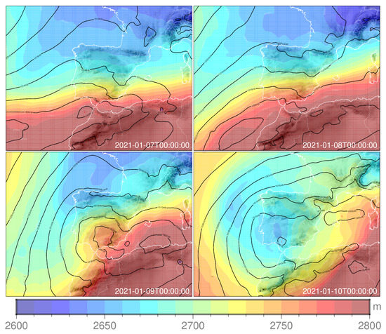 Maps of 600–850 hPa layer thickness (shaded) and sea level pressure (contours) associated with Storm Filomena on 7–10 January 2021 at 00:00 UTC.