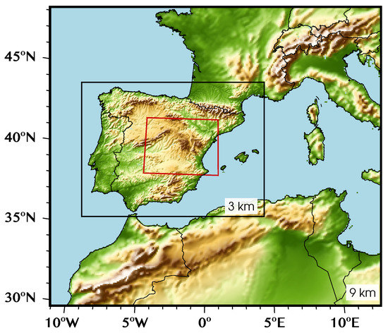 Regarding the general physical configuration, radiation was parameterized with the rapid radiative transfer model for global climate models (RRTMG) by Mlawer et al. [32], both for short- and long-wave radiation, updated every 30 min. The surface layer parameterization was solved with the Mesoscale Model MM5 scheme based on the similarity theory by Monin and Obukhov [33] and using the revised scheme of Jiménez et al. [34], while the The unified NOAH LSM option was used for the land surface calculation [35]. Four soil layers were considered in the land surface model, and the Yonsei University scheme was employed for the boundary layer [36], solved every time step ( = 0). Heat and moisture fluxes from the surface were activated ( = 1), as well as the cloud effect to the optical depth in radiation ( = 1). Conversely, snow cover effects were deactivated ( = 0). Land-use and soil-category data came from WPS geogrid but with dominant categories recomputed ( = 1). The urban canopy model was not considered ( = 0), and the topographic surface wind correction from Jiménez and Dudhia [37] was turned on. Both feedback from the parameterized convection to the radiation schemes and SST update (every 6 h, coinciding with boundary conditions update) were also turned on. The simulations were run in two one-way nested domains, D01 and D02, having 9 and 3 km of horizontal grid resolution. respectively, and arranged as indicated in Figure 2. Regarding the cumulus physics, Grell 3D ensemble ( = 5; = 0) was chosen to parameterize convection [38] in the coarse domain D01. For D02, no cumulus parameterization was used, considering its resolution to be within the convection-permitting zone. The output of the simulations for the coarser domain were used only to feed the finer simulations using a one-way nesting strategy. Data from an ERA-interim global atmospheric reanalysis was used to provide the simulations with the required initial and boundary conditions (every 6 h) [39].