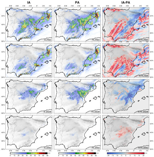 First of all, the effect of interactive aerosols in the simulation of Storm Filomena was analyzed by direct comparison of interactive aerosols and the default prescribed aerosol simulations (PA1E9, hereunder PA throughout this subsection). Figure 3 shows the patterns of total precipitation (first row), rain (second row), snow (third row) and graupel (fourth row), accumulated during the study period (from 8 January 2021 07:00 UTC to 10 January 2021 07:00 UTC), for the IA (first column) and PA (second column) simulations, as well as their differences (third column).