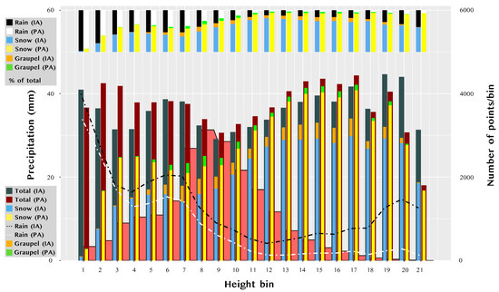 With the aim of diving into the causes of these differences, we first selected a spatial window to restrict the area under study: the area in which the snowfall was more intense (see red box in Figure 2). A land mask was also employed to remove sea grid cells. Then, the points were separated into bins according to their terrain height; 21 bins were created, containing points with heights from 0 to 2000 m above sea level (ASL) every 100 m. For each bin, the precipitation of the grid cells was averaged for each precipitation type. Figure 4 shows for each bin, the total precipitation split into rain, snow and graupel for both the IA (grey, black, blue and orange) and PA (red, white, yellow and green) simulations. The number of points within each bin is also depicted (salmon shading). Additionally, the percentage of each precipitation type is shown in the top bars.