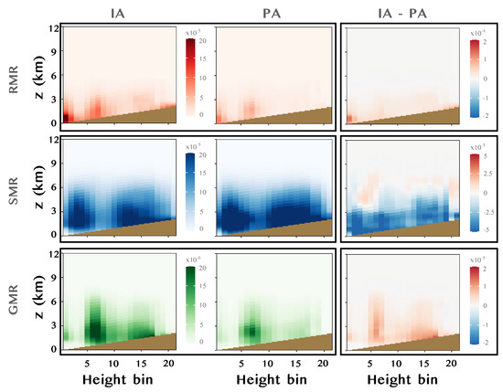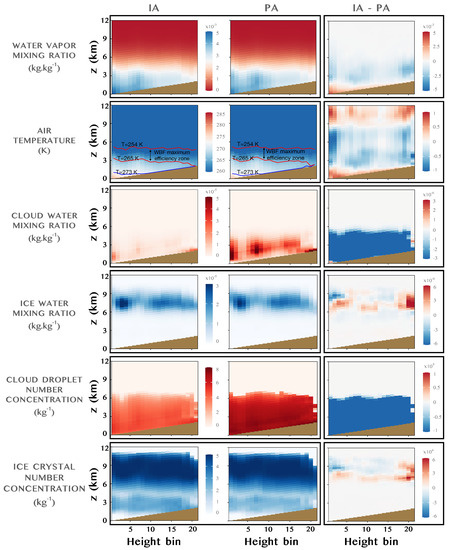 From the first two columns of Figure 5 and Figure 6, we see that rain mainly falls in the height bins of 0 to 100 m ASL, which correspond to the coastal points to the east of the IP, where the moist air mass coming from the Mediterranean region encounters land. There is also rainfall in higher locations corresponding to continental points of lower latitudes, where the snow level is still high. When moving inward, precipitation is released as snow. A part of the precipitation is formed as graupel close to the warm front (not shown), a zone of higher updraft, which is in line with the theory of Braham [2]. The most intense graupel production appears on points with terrain height around the snow level, provided that these points induce orographically induced convection with strong updrafts that favour the formation of graupel. In this case, there exists a depletion of ice crystals due to their rapid conversion into graupel when the freezing contact of supercooled water-cloud droplets with them takes place. According to Figure 5, the depletion of ice crystals is also strong in the zone of maximum WBF efficiency, where a horizontal band of lesser concentration of ice crystals may be clearly seen. Regarding the differences between IAs and PAs, IAs lead to a lower production of snow, compensated—only partially, as demonstrated later—with an increase of rainfall and graupel formation. Graupel is formed in zones of increased LWC, a result in line with the theory of graupel formation introduced by Matsuo et al. [20], analyzed in more detail in Section 3.2. For heights well above the freezing level, snow is the principal precipitating hydrometeor, which is more abundant in the PAs than in the IA simulation. Concerning the temperature distribution, a difference of approximately 1 degree is reached below the freezing level. There, the IA simulation produces a higher temperature, which is probably related to the increased aerosols dry radius and hygroscopicity, producing a more rapid hygroscopic growth and the release of latent heat. In the PA, this hygroscopic growth is expected to be slower and less effective provided that a lower hygroscopic growth factor and smaller aerosols are considered. This air temperature difference also implies a difference in the water vapor mixing ratio as extracted from the Clausius–Clapeyron equation. For heights above the freezing level, and specially in the zone of maximum WBF efficiency, the latent heat of freezing and deposition comes into play, leading to higher temperatures in the PA case, in which these processes are more effective than in the IA case: in PAs we observe a higher cloud water mixing ratio—i.e., of supercooled water. As these are smaller and more numerous cloud droplets than those of the IA case, their evaporation is more prone, thus enhancing the WBF process, and their availability for ice riming growth in mid tropospheric levels is also higher. Thus, in the PA case, the increased supercooled liquid water content produces the mentioned increase in the efficiency of snow production, and conversely reduces the rain and graupel production rates. The 5% decrease in total precipitation observed in Figure 3 for the IA simulation may be caused by the decreased efficiency of the WBF process. The riming efficiency, in case of increasing with decreased aerosols, is too weak to balance the decrease in WBF efficiency. The reduction in snow production in the IA case is partially compensated by an increase in the liquid precipitation in the easternmost locations of the IP. In the rest of the domain, temperatures are too low for the warm processes to compensate the defect of snow production.