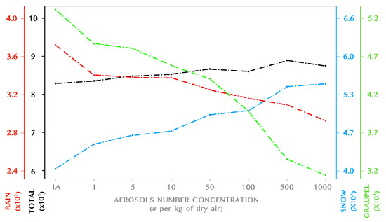 On another note, when aerosol concentration is decreased, rain production is more effective, provided that the mean droplet size is higher and precipitable sizes more easily reached by C–C processes. In addition, graupel production is more effective due to the increased droplet size, as shown in the CDR column of Table 1. In fact, according to the numbers provided in Matsuo et al. [20], the droplet sizes are above the threshold of effective graupel production (10 μm) in all the simulations with aerosol concentrations below aerosols per cubic centimeter of dry air. The LWC threshold, around 0.4 g·m−3, is exceeded in all simulations, thus being the mean droplet size that is the most determinant factor in the production of graupel. Therefore, the lower the aerosol concentration is, the larger the droplet size and the more effective the graupel formation process.
