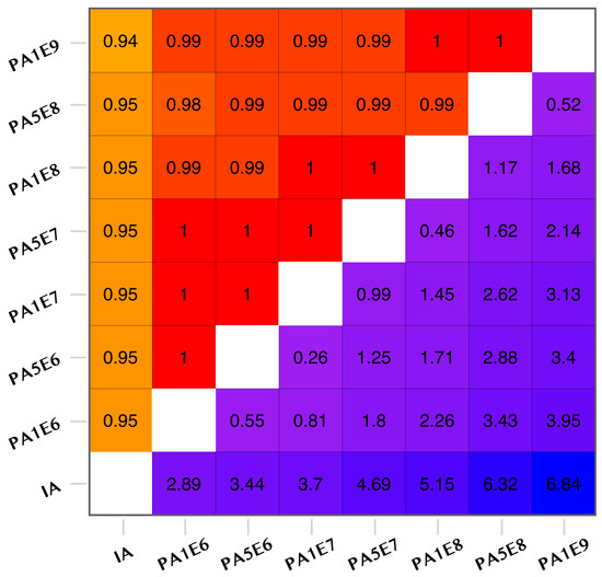 We concluded earlier that the increase in the ice crystal growth efficiency for higher aerosol concentrations leads to enhanced snowfall, which is counterbalanced with the rainfall and graupel production increase, although just partially. This provoked an increase in the total precipitation for higher aerosol concentrations. Provided that the water vapor mixing ratio is practically conserved for all simulations, we conclude that the increase in the mean droplet size, which causes a decrease in the snow formation efficiency, does not increase the rain and graupel forming efficiencies in the same proportion. Thus, an excess of supercooled water should exist with decreased aerosols, especially in mid and high levels, due to this lower efficiency of precipitation production, probably covered by the larger defect of cloud water precisely due to this increase in the mean droplet size. Moreover, the change in precipitation between the PA1E6 and the IA simulations is higher than expected according to the differences in cloud droplet number concentration and mixing ratio that they show. With a view to inquiry into this fact, we analyze both the spatial correlation of the accumulated snow patterns in the different simulations, as well as their the mean of their differences. The results of this analysis are shown in Figure 8, in which the correlation (upper diagonal) and mean bias (lower diagonal) are presented for every pair of simulations.