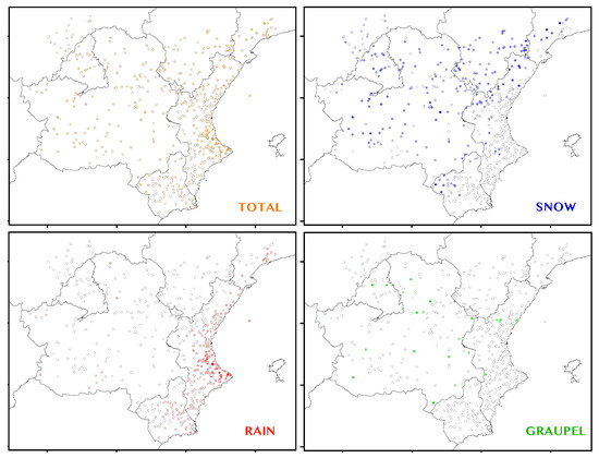 Locations of the stations in the data set employed for the validation of simulations. Colors indicate precipitation registered at each station during the study period, scaled to the maximum of each precipitation type (top left: total precipitation, top right: snow, bottom left: rain and bottom right: graupel). Data obtained under direct request to AEMET.