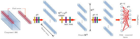 For the Spectral DL model (1DCNN) in Figure 3, the spectral pixels are the input data, where is the number of bands of the image with or without compression. On each convolutional layer (CONV), 1D-kernels are applied, such that , obtaining as a result an output composed of feature vectors [2].