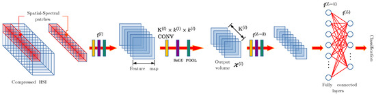 Spectral–spatial DL models (3DCNN) extract spectral and spatial features at the same time, see Figure 5. Similarly, as with 2DCNN, the features are extracted from spatial patches of , associated with a single pixel of the HSI. This model uses 3D-kernels, such that , extracting feature volumes as output [2].
