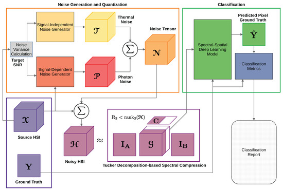 This section presents a short description of the theoretical concepts used in each stage of the proposed semantic segmentation framework. First, tensor theory for HSI representation and compression based on the TKD is used [38]. Second, a noise model for hyperspectral imagery is used in this paper for noise generation [3,4,39]. Finally, DL spectral and spatial feature extraction models [2,10,40] with metrics are used to compare ground truth labels and predicted ones for unbalanced training scenarios [41,42,43].