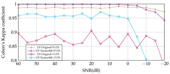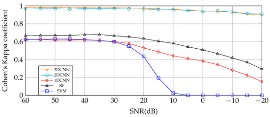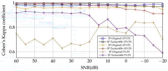 The case when shows a perfect agreement between the GT and predicted labels. means that there is a chance of agreement, but if K is negative, it is a clear disagreement. Each class classification must have importance; for that reason, all the results are presented with Cohen’s Kappa coefficient, but the other two metrics (OA and AA) can be consulted in the log files available in the public repository of this paper [54].
