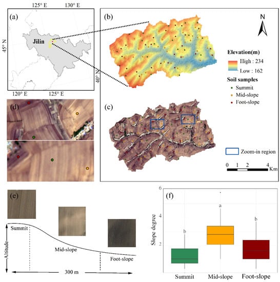 (a,b) Spatial distribution of the sampling points overlaid on the digital elevation model of the catchment in northeast China; (c,d) a Sentinel-2 true color image (13 May 2021) of the catchment showing the large percentage of exposed bare soils, and zoom-in areas depicting the selection of sampling points; (e,f) representative sampling locations along typical slope profiles with average length at ca. 300 m and their corresponding slope degrees. Different letters indicate significant differences among the three groups (p < 0.05).