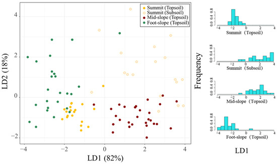 Classification of three slope positions based on linear discriminant analysis (LDA) of PC scores arising from laboratory-based VNIR spectra. Subsoil spectra of Summit positions were included to investigate any spectral similarity to the topsoil of Mid-slope positions. Histograms on the right show the distribution of the first LD function’s value for the four sample groups.